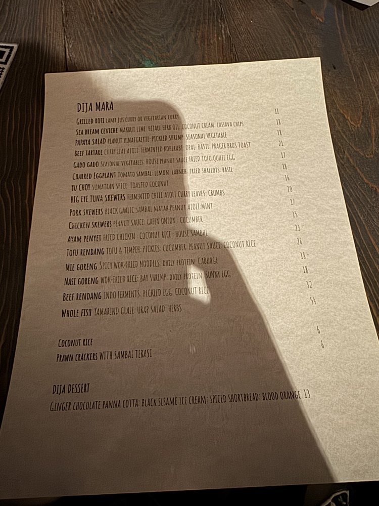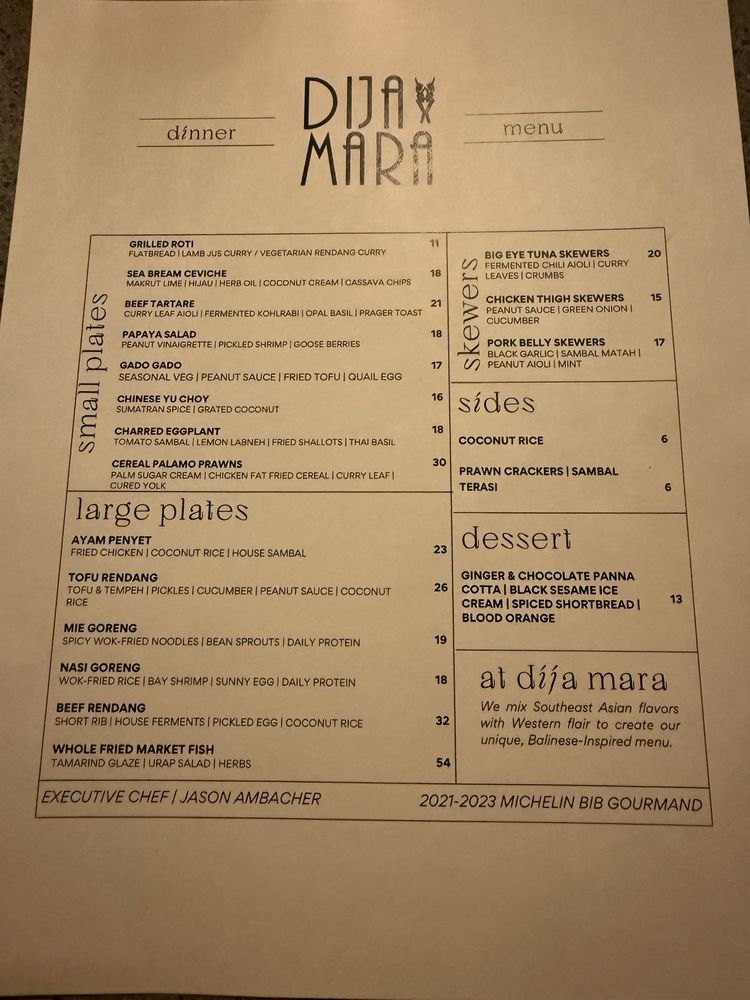 Introducing the menu at Dija Mara, a captivating New American restaurant nestled in Oceanside, CA, where Indonesian flavors reign supreme. The menu artfully blends local ingredients with traditional recipes, resulting in vibrant dishes designed for sharing.